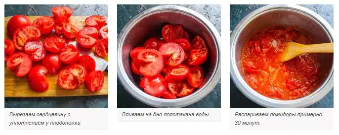 Накрываем кастрюлю крышкой плотно. Нагреваем содержимое до кипения. Распариваем помидоры примерно 30 минут. Может понадобиться чуть больше или меньше времени, оно зависит от сорта овощей и их размера. Нужно попробовать ложкой, если помидоры превратились в однородную бурлящую массу, то можно переходить к следующему этапу приготовления.